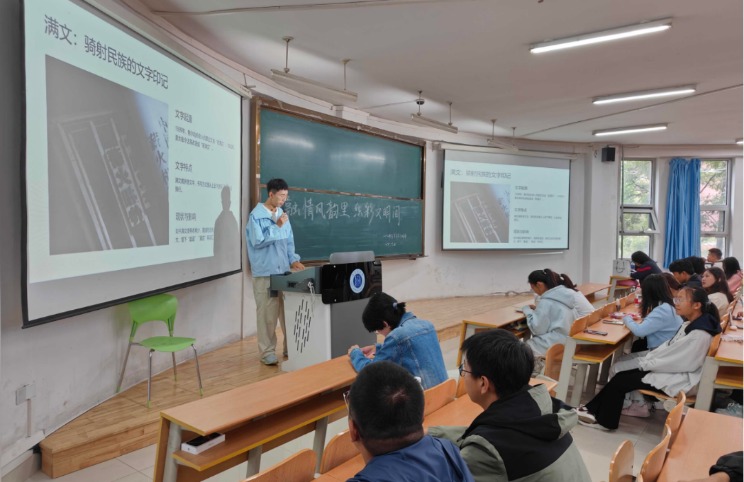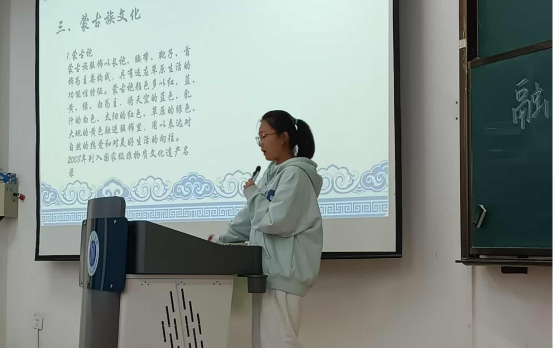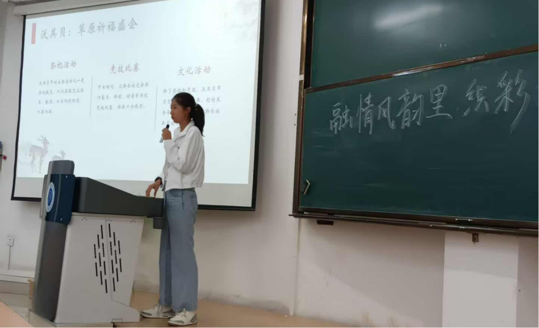智建2501班的蒙古族学生刘珩平与包戴钦共同带来分享。他们介绍了蒙古族主要分布在内蒙古自治区,蒙语和蒙文传承悠久。展示了镶有皮毛的蒙古袍,介绍了手扒肉、奶茶等民族饮食,以及蒙古包的搭建特点、那达慕大会的竞技项目。现场播放了马头琴曲目,让同学们沉浸式感受了蒙古族文化的豪迈与灵动。